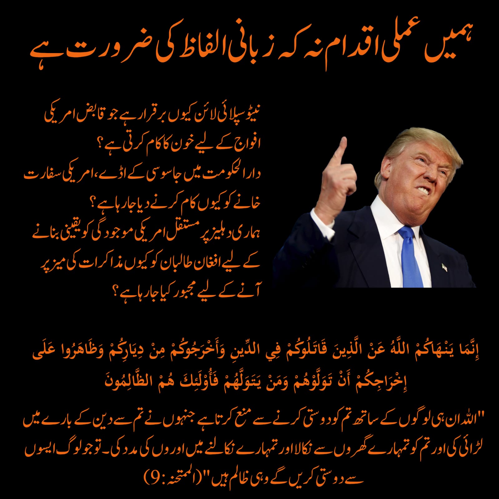افغانستان میں امریکی جنگ کی وجہ سے پاکستان کو لگنے والے زخموں پر ٹرمپ کی نمک پاشی کے ایک دن بعد حکمران جماعت پی ٹی آئی نے اس کا زبانی جواب دیا جبکہ عمل سے اس کا جواب دیا جانا وقت کی ضرورت ہے۔ 19 نومبر 2018 کو پی ٹی آئی کی وزیر برائے انسانی حقوق ڈاکٹر شیریں مزاری نے کہا ، ”امریکا کی دہشت گردی کے خلاف جنگ میں پاکستانی جانوں کا نقصان، ریمنڈ ڈیوس اور دوسرے آپریٹیوز کو دی جانے والی کھلی چھوٹ، ڈرون حملوں کے ذریعے غیر قانونی قتل- یہ فہرست ختم ہونے والی نہیں“۔ انہوں نے مزید کہا ،”ایک بار پھر تاریخ نے ثابت کیا ہے کہ خوشامد کام نہیں آتی“۔ ان الفاظ کا کیا فائدہ جبکہ عملی طور پر باجوہ-عمران حکومت پچھلی حکومتوں کی طرح امریکا سے مکمل تعاون کررہی ہے؟َ ایک طرف تو امریکہ کے خلاف سخت الفاظ استعمال کیے گئے مگر دوسری طرف باجوہ-عمران حکومت نے نیٹو سپلائی لائن کو امریکہ کی خاطربرقرار رکھا ہوا ہےجو کہ افغانستان میں امریکا کی قابض فوج کی بقاء کے لیے انتہائی ضروری ہے ۔ ایک طرف کھل کر ٹرمپ کے بیان کو مسترد کیا جارہا ہے تو دوسری جانب طالبان کوامریکا کے ساتھ مذاکرات کی میز پر بٹھانے کے لیے باجوہ-عمران حکومت اپنے اثرورسوخ کو پوری طرح سے استعمال کررہی ہے تا کہ مسلم دنیا کی واحد ایٹمی قوت کی دہلیز پر امریکا کو مستقل قیام کے لیے قانونی سہارا مل جائے۔ ایک طرف لوگوں کو دھوکہ دینے کے لیے شعلہ بیانی کی جارہی ہے تو دوسری جانب امریکا کے ساتھ مکمل طور پر فوج اور انٹیلی جنس کی سطح پر روابط برقرار ہیں جس کے بغیر امریکا ریاستوں کے قبرستان، افغانستان، میں اندھا، بہرا اور گونگا ہو جائے گا۔ باجوہ-عمران حکومت اس بیان بازی کے ذریعے امت کودھوکہ دے رہی ہے، اگر وہ سچی ہے تو دارالحکومت میں موجود امریکہ کے جاسوسی کا اڈے، اس کے سفارت خانہ، کو کیوں بند نہیں کرتی؟