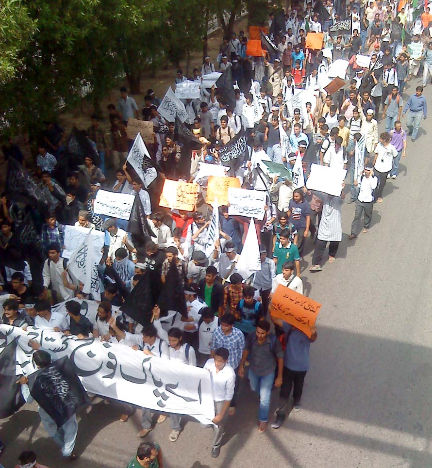 کراچی، جو کہ پاکستان کا سب سے بڑا شہر اور معاشی مرکز ہے، کے مسلمان شہریوں نے رسول اللہ ﷺ کی توہین کا بدلہ لینے کے لیے زبردست ریلی نکال کر پاکستان کے جابر حکمرانوں کے منہ پر تھپڑ مارا ہے۔ پاکستان میں امریکہ کے غلام اور چوکیدار کیانی اور زرداری اینڈ کمپنی نے جمعہ کے دن کو اچانک عوامی تعطیل قرار دے کر رسول اللہ ﷺ کی توہین کے خلاف ہونے والے ملک گیر مظاہروں کو ناکام بنانے کی کوشش کی ہے۔ اوبامہ کی خوشنودی اور رضا مندی کے لیے ان بے شرم حکمرانوں نے امریکی سفارت خانوں کو قلعوں میں تبدیل کر دیا ہے، جمعہ کے دن تمام موبائل فون سروس کی بندش کا اعلان کر دیا ہے اور اسلام آباد کے داخلی اور خارجی راستوں کو تقریباً بند کر دیا ہے۔ انھوں نے انٹیلی جنس ایجنسیوں کے اہلکاروں کی بڑی تعداد کو تعینات کر دیا ہے تا کہ وہ ان مظاہروں اور ریلیوں میں بدنظمی پیدا کر کے مظاہرین کو امن وامان کی صورتحال پیدا کرنے کا ذمہ دار قرار دے دیں۔ لیکن کراچی کے مسلمانوں نے ایسا جواب دیا ہے جو عاشقان رسول ﷺ کے شایان شان ہے۔ حکمرانوں کی اس مکروح حرکت کو ناکام بناتے ہوئے ایک دن قبل ہی کراچی کے لوگوں نے بڑی تعداد میں حزب التحریر کی ریلی میں شرکت کی۔ انھوں نے افواج پاکستان سے مطالبہ کیا کہ وہ فوراً امریکی سفارت خانے اور اڈوں کو بند کریں اورتمام امریکی سفارت کاروں اور فوجی اینٹیلی جنس اہلکاروں کو ملک بدر کریں۔ انھوں نے خلافت کے فوری قیام کا مطالبہ بھی کیا جو صحیح معنوں میں امت اور اس کے دین کی نگہبان ہوتی ہے۔