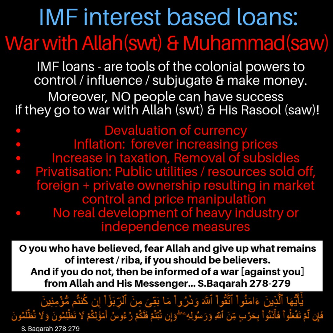 آئی ایم ایف ،بدنامِ زمانہ برطانوی ایسٹ انڈیا کمپنی کا جانشین استعماری ادارہ ہےجس نے برصغیر پاک و ہند کو غربت کی دلدل میں دھکیل دیا تھاحالانکہ یہ خطہ اسلامی دور حکومت میں انتہائی دولت مندخطہ تھا ۔ آج آئی ایم ایف پوری دنیا پر مغرب کی معاشی بالادستی برقرار رکھنے اور اسے یقینی بنانے کے لیے کام کرتا ہے۔ اس مقصد کے حصول کے لیے وہ قرض لینے والے ممالک پر تباہ کن معاشی شرائط مسلط کرتا ہے اور انہیں مغربی ریاستوں کا مدمقابل بننے سے روکتا ہے۔