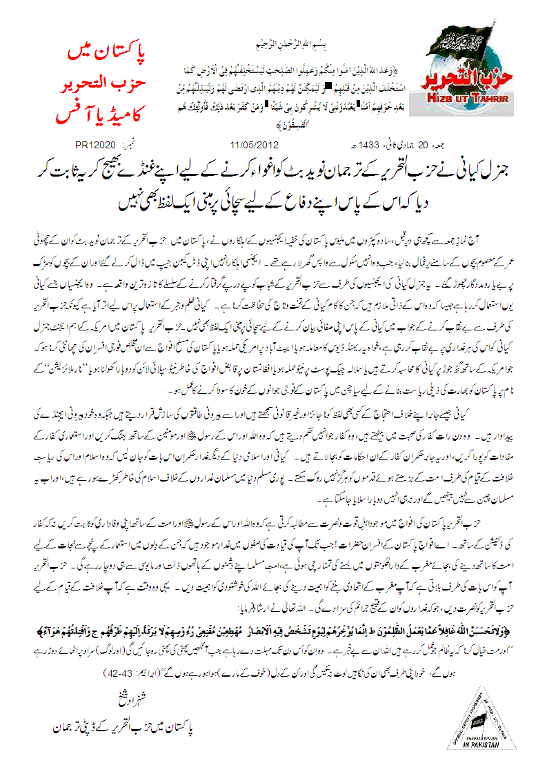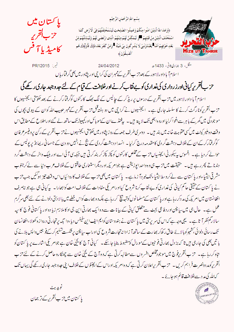 کیانی اور سیاسی و فوجی قیادت میں موجود اس کے ساتھی غنڈوں نے خلافت کے قیام کی پکار کے خلاف اعلان جنگ کے بعد اپنے غلیظ ہتھکنڈوں میں مزیداضافہ کر دیا ہے۔ حزب التحریر کے شباب کی گرفتاریوں، اغوا اور غائب کیے جانے کے باوجود خلافت کے قیام کی سرگرمیوں میں کسی قسم کی کمی نہ دیکھتے ہوئے اب کیانی اور سیاسی و فوجی قیادت میں موجود اس کے چند ساتھیوں نے حزب التحریر کے شباب کے بوڑھے والدین کو اپنے ظلم کا نشانہ بنانا شروع کر دیا ہے۔ پشاور میں گرفتار کیے گئے حزب التحریر کے رکن کی ضمانت کی سماعت کے دوران پولیس نے انتہائی سرعت کے ساتھ ان کے والد کو اس الزام میں گرفتار کر لیا کہ وہ اس کار کے مالک ہیں جو رکن نے پمفلٹ کی تقسیم کے لیے مسجد پہنچنے کے لیے استعمال کی تھی۔ اسی طرح 29 مارچ کو لاہور ماڈل ٹاون میں واقع ایک گھر پر حکومتی غنڈوں نے اس وقت حملہ کیا جب وہاں پر ایک ہفتہ وار درس ہو رہا تھا۔ اس دن سے اس گھر کے بوڑھے مالک اب تک صرف اس لیے جیل میں ہیں کہ انھوں نے اپنے گھر کو اسلام کی ترویج کے لیے وقف کیا تھا۔ رسول اللہ ﷺ نے فرمایا: